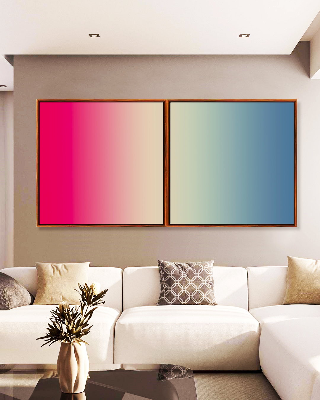 Com contraste vibrante de rosa choque e delicadeza da areia e azul, este Duo de Quadros Quadrados é a escolha certa para quartos, escritórios ou salas de estar. Um toque contemporâneo e elegante que transforma qualquer ambiente com estilo e personalidade.