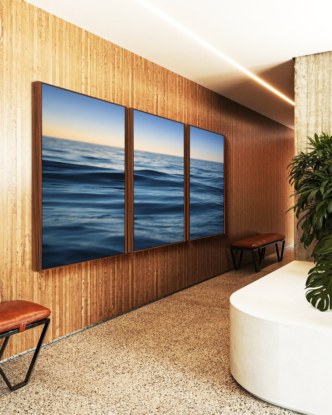 Nascer do sol sobre mar azul com ondas suaves e atmosfera tranquila. Inspira calma, horizonte e natureza. Ideal para salas, quartos, escritórios ou ambiente de descanso com estilo praiano, litoral e decoração leve.