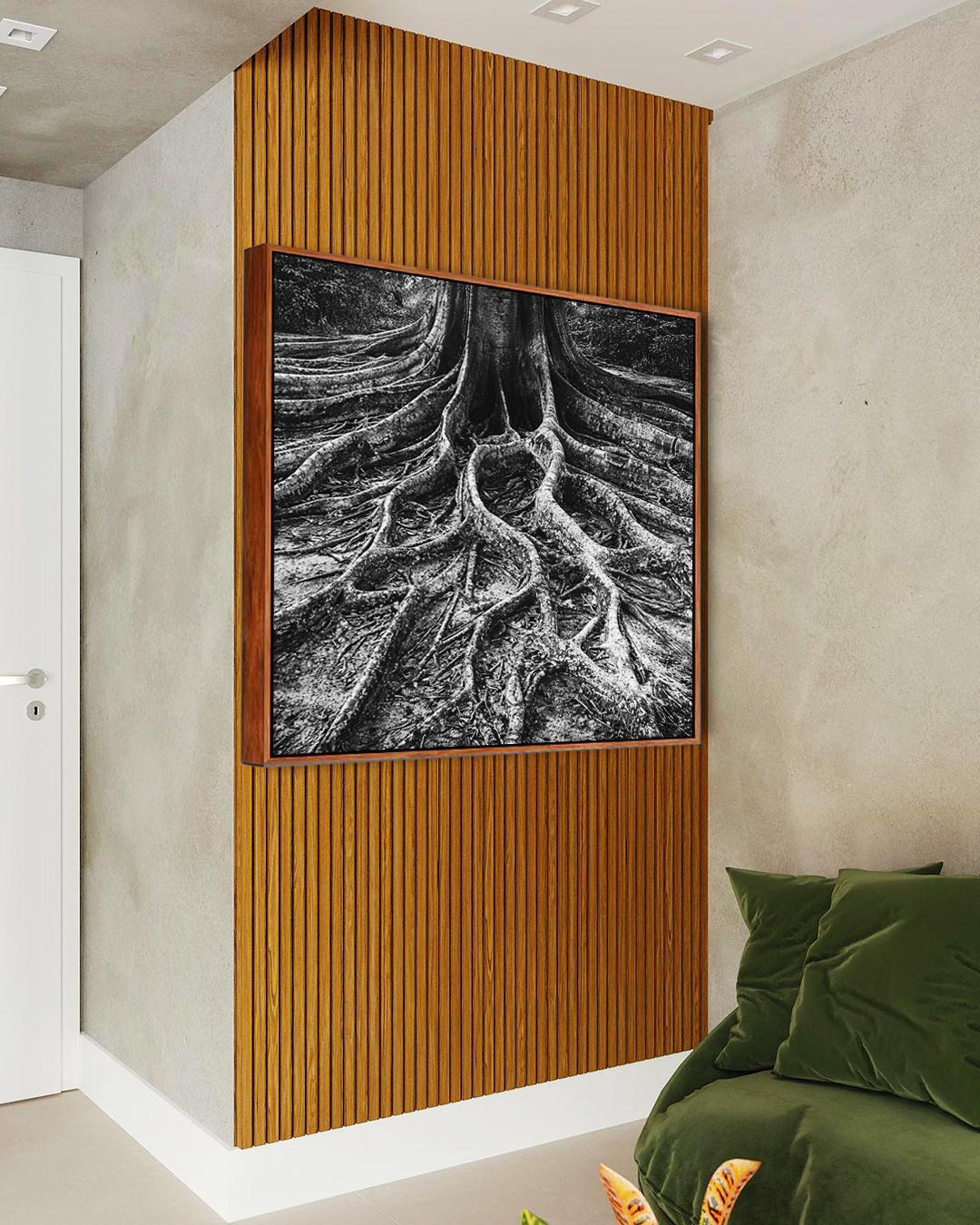 Raízes profundas de árvore em preto e branco criam impacto visual, destacando linhas orgânicas, natureza e textura natural. Estilo elegante e contemporâneo que harmoniza com decorações modernas. Ótima escolha para salas, escritórios e recepções.