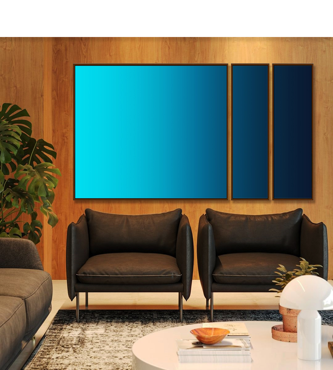Com transição suave entre tons de azul celeste e marinho, este Trio de Quadros Estilizados cria sensação de equilíbrio e serenidade. Ideal para valorizar salas de estar, quartos refinados, escritórios profissionais ou halls de entrada bem planejados.
