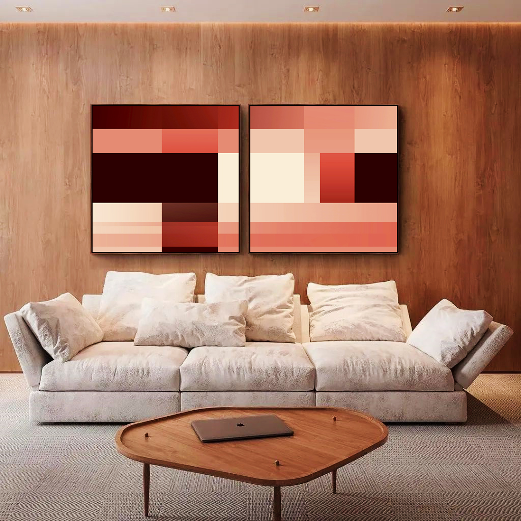 O degradê entre rosa e marrom dá a este Duo de Quadros Quadrados um charme sofisticado e acolhedor. A escolha certa para transformar salas, quartos ou escritórios em ambientes elegantes, modernos e cheios de harmonia visual, com um toque artístico.