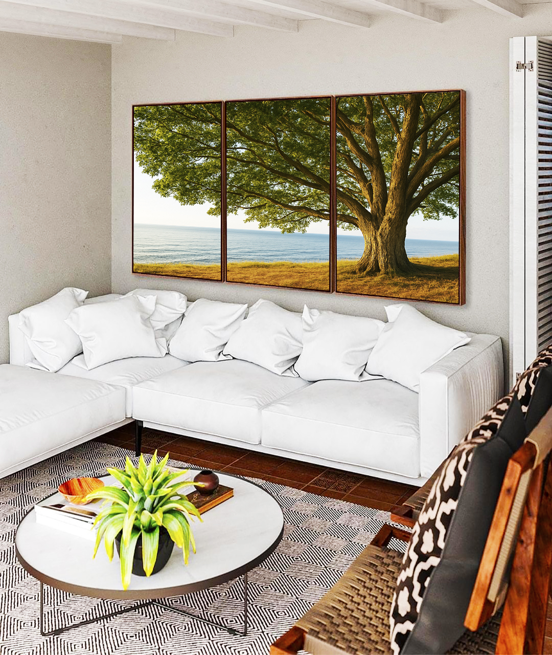 Com mar tranquilo e árvore em destaque, este Trio de Quadros traduz harmonia e contemplação. Ideal para salas, quartos ou halls de entrada, ele transforma o espaço com um toque natural, elegante e atemporal, perfeito para quem busca serenidade.