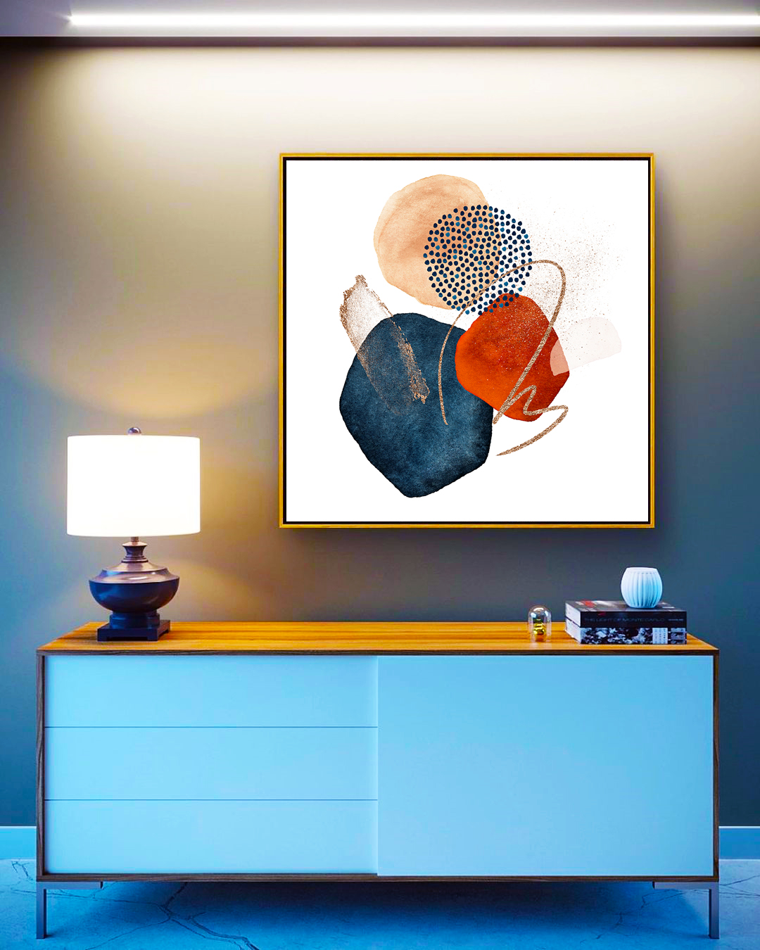 Este Quadro Quadrado abstrato minimalista de formas em azul e terracota traz modernidade e sofisticação. Produzido em canvas com moldura flutuante, é ideal para salas, quartos, escritórios e halls de entrada, criando um ambiente elegante acolhedor.