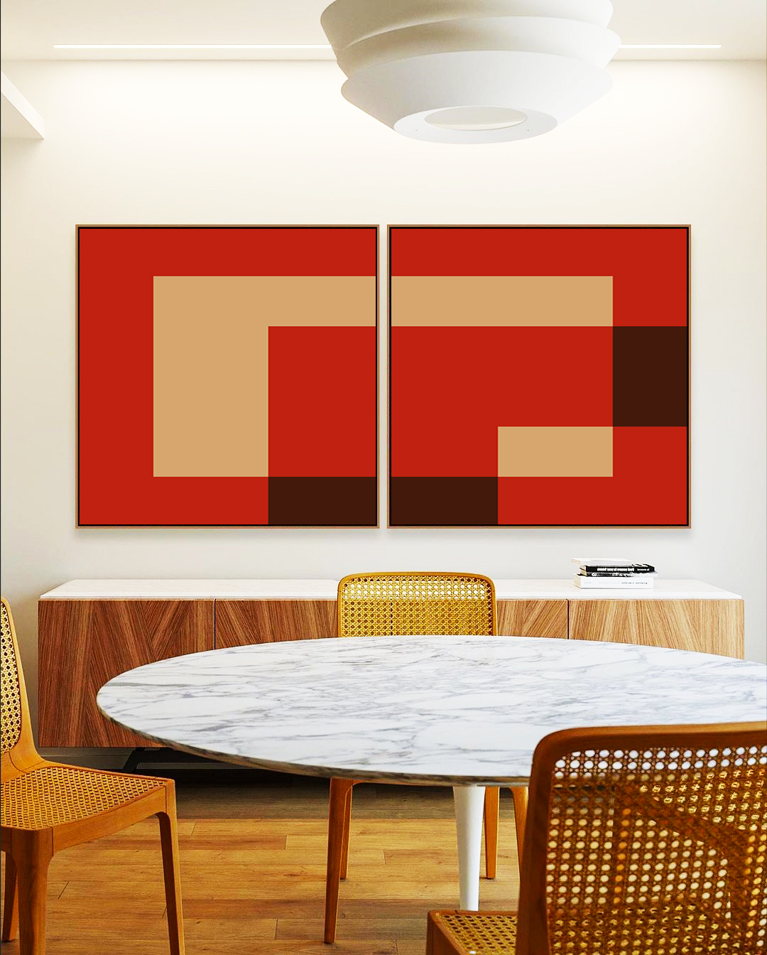 O contraste entre o vermelho e o marfim cria uma atmosfera moderna e acolhedora. Um Duo de Quadros Quadrados de linhas geométricas que é a escolha certa para transformar sua sala, quarto ou hall em um ambiente cheio de estilo.
