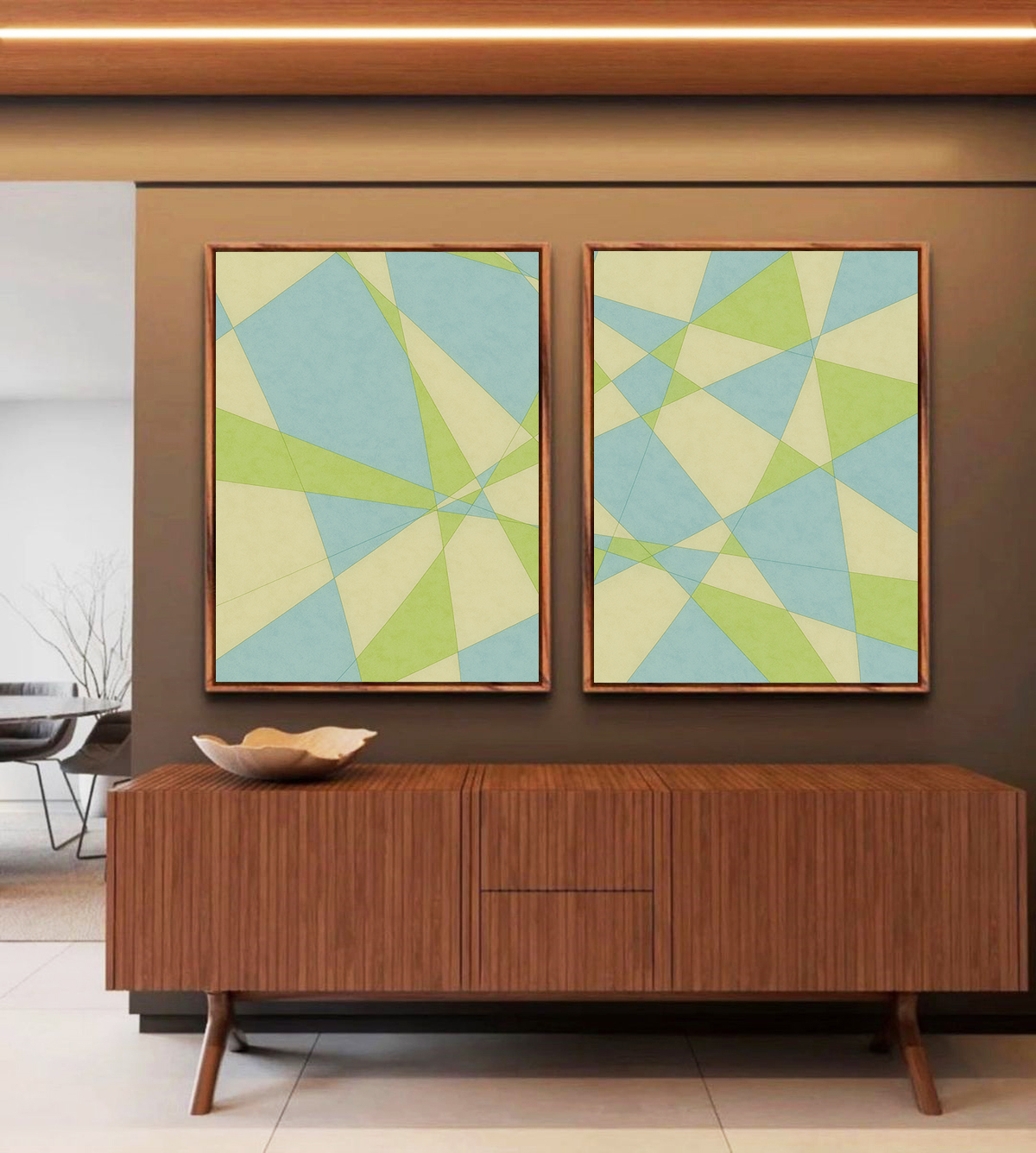 Este Duo de Quadros Abstrato em mosaico combina azul celeste e verde menta com elegância. Moldura Moderna valoriza cada detalhe. Perfeito para renovar sua sala, quarto ou escritório com estilo contemporâneo e atmosfera sofisticada.