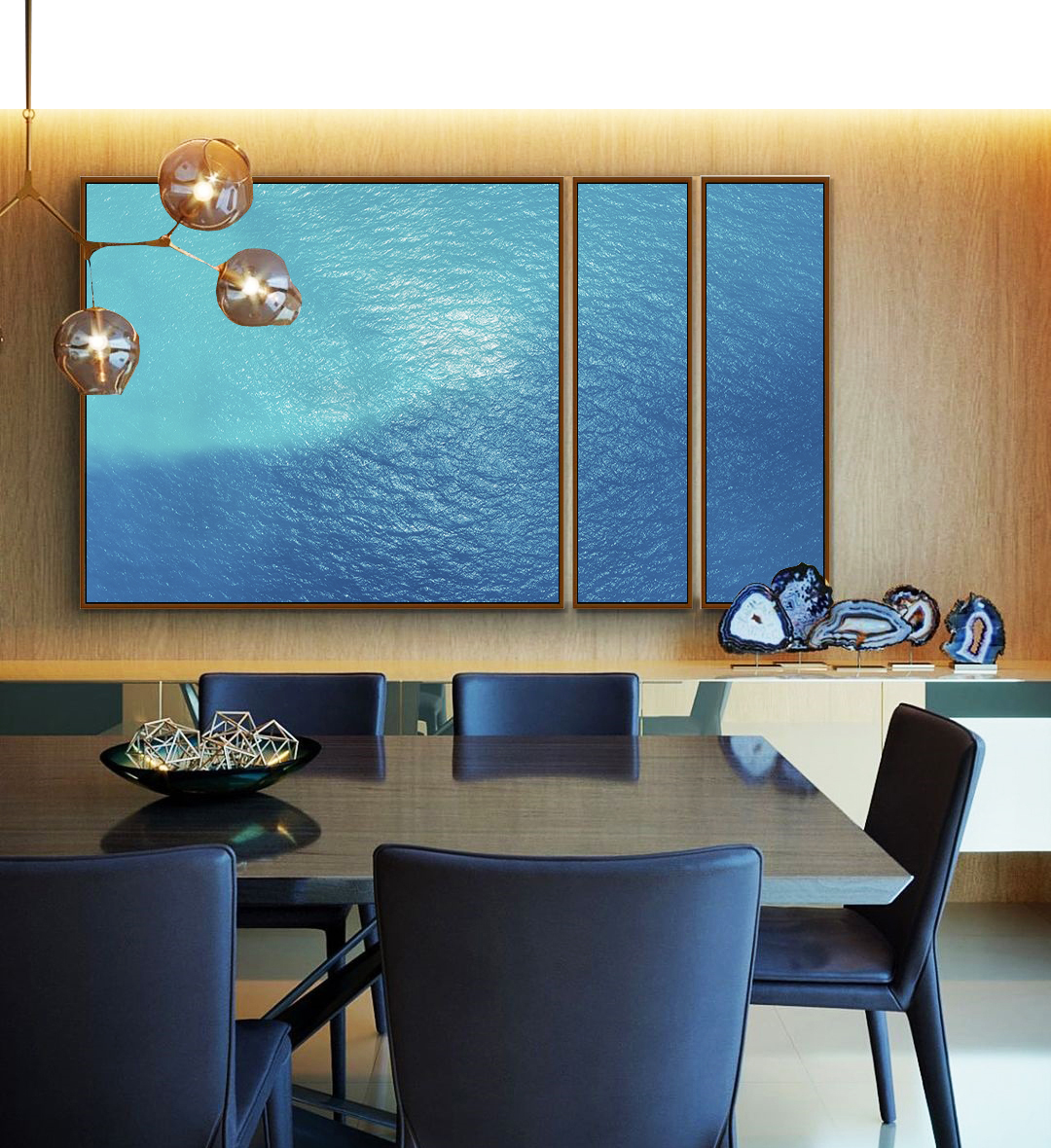 Profundo e expressivo, este Trio de Quadros Estilizados retrata o mar alto em azul intenso com textura natural, criando impacto visual e movimento elegante. Ideal para valorizar salas amplas, quartos sofisticados ou escritórios profissionais.