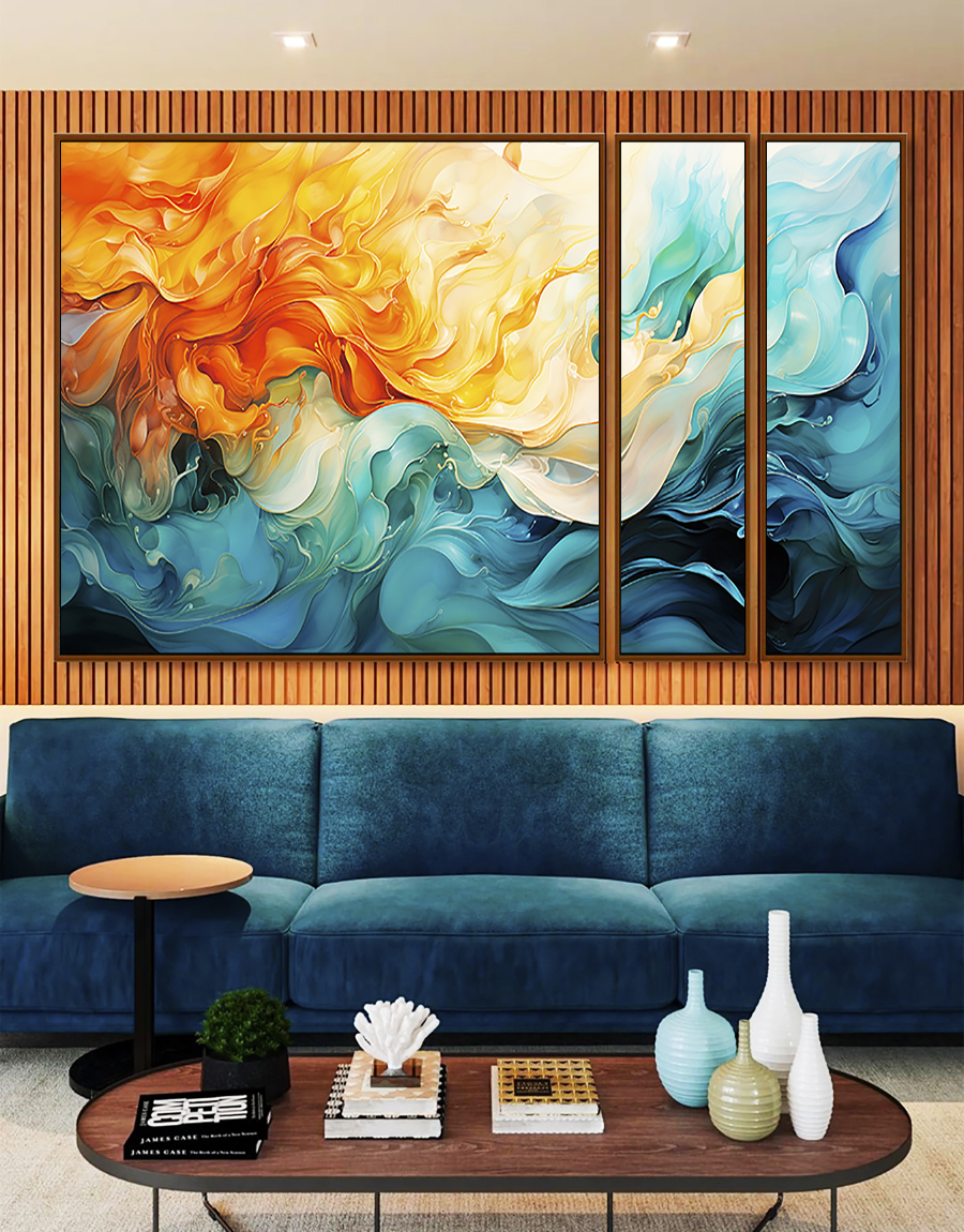 Modernize sua decoração com este Trio de Quadros Estilizados em arte fluida pouring. Cores vibrantes como azul turquesa e amarelo iluminam o ambiente. Ideal para sala, hall ou quarto com moldura flutuante e canvas premium. Belíssimo e Encantador.