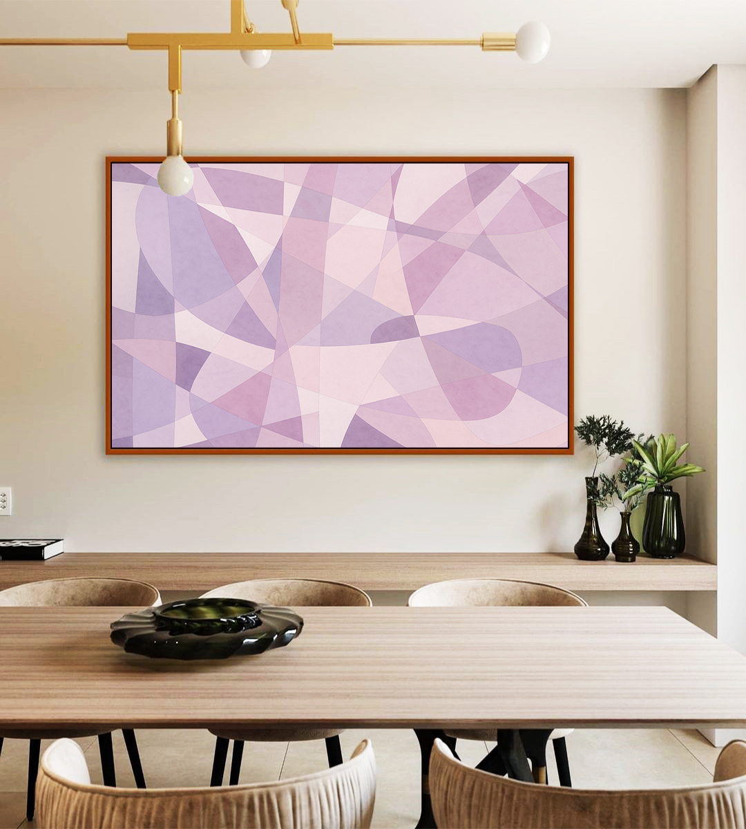 Quadro Horizontal com mosaico abstrato em roxo, lavanda, rosa e branco. Moldura flutuante valoriza a arte, criando um visual sofisticado. Ideal para decorar salas, quartos ou escritórios, trazendo leveza e sofisticação contemporânea.