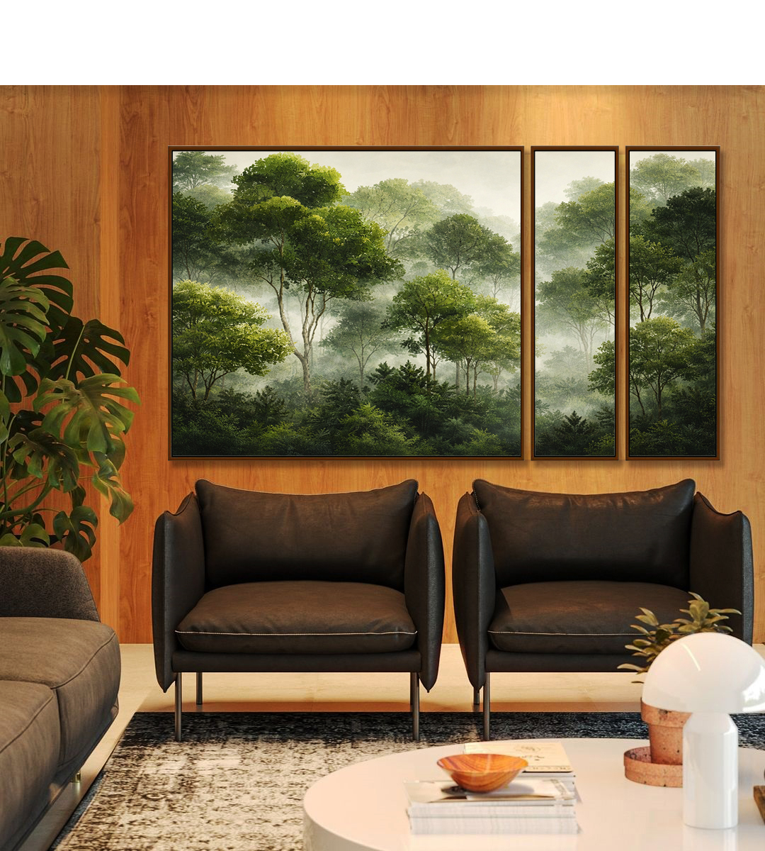 Trio de Quadros Estilizados Floresta Árvores Verdes Neblina Natureza Canvas Moldura