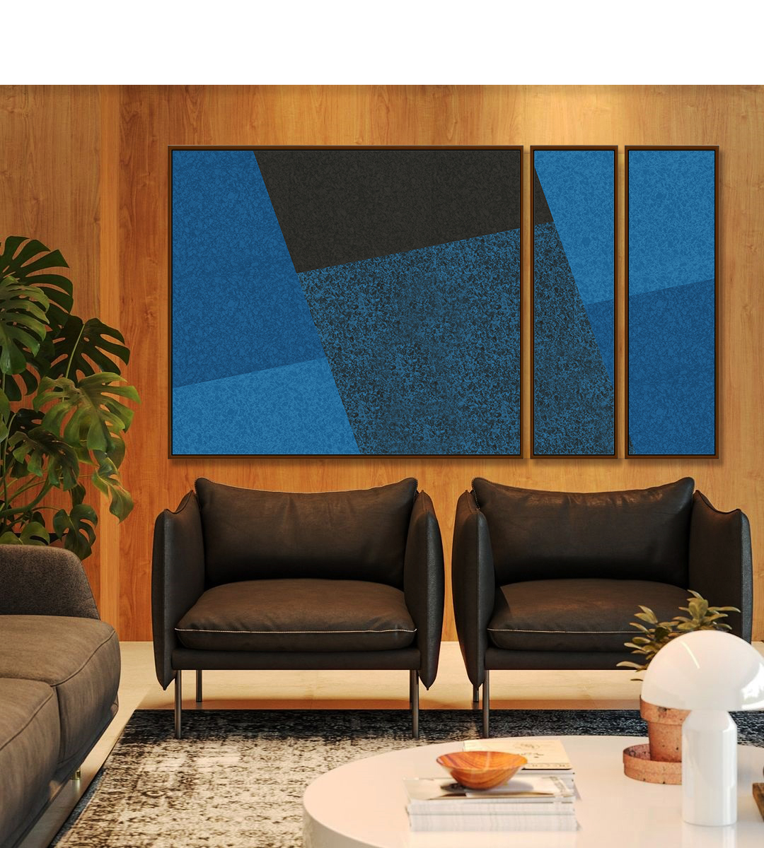 Trio de Quadros Estilizados Abstrato Geométrico Minimalista Azul Canvas Moldura