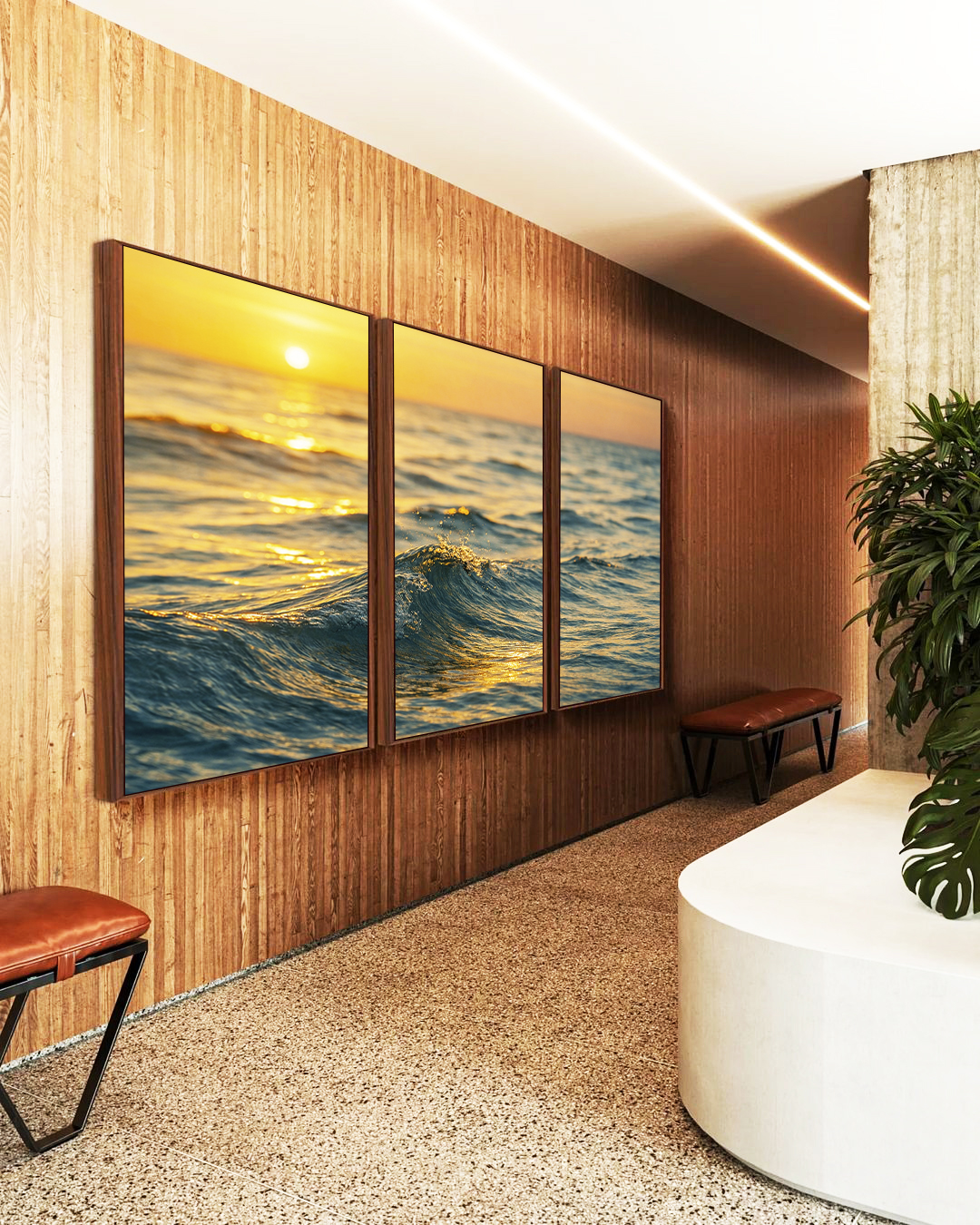 Pôr do sol sobre o mar com ondas suaves e brilho prateado que transmite paz e elegância. Ideal para sala de estar, quarto, escritório, consultório ou casa de praia. Perfeito para decoração litorânea, estilo contemporâneo e ambientes relaxantes.