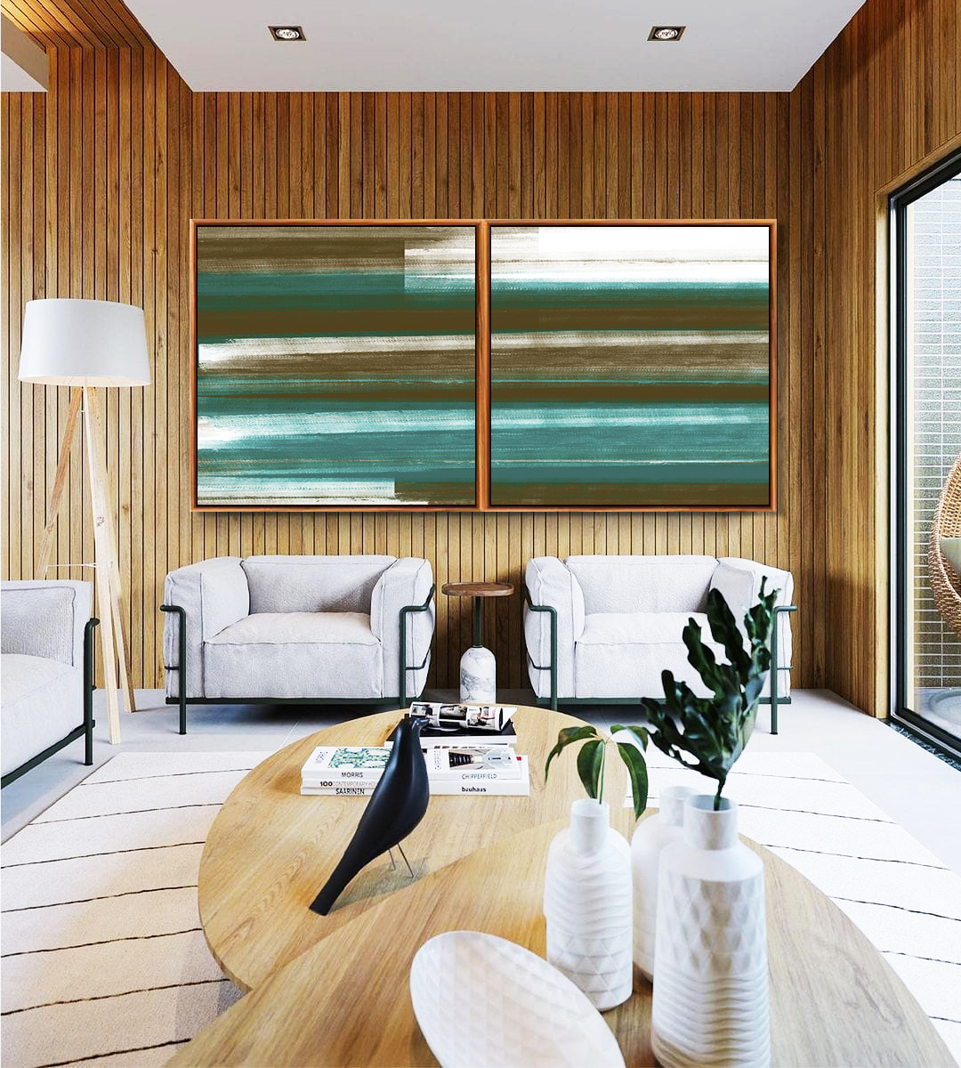 Tons de verde oliva, turquesa e branco formam uma estética abstrata elegante e atual. O contraste suave ilumina o ambiente e transmite tranquilidade, sendo uma excelente escolha para salas, quartos e espaços com proposta clean e sofisticada.