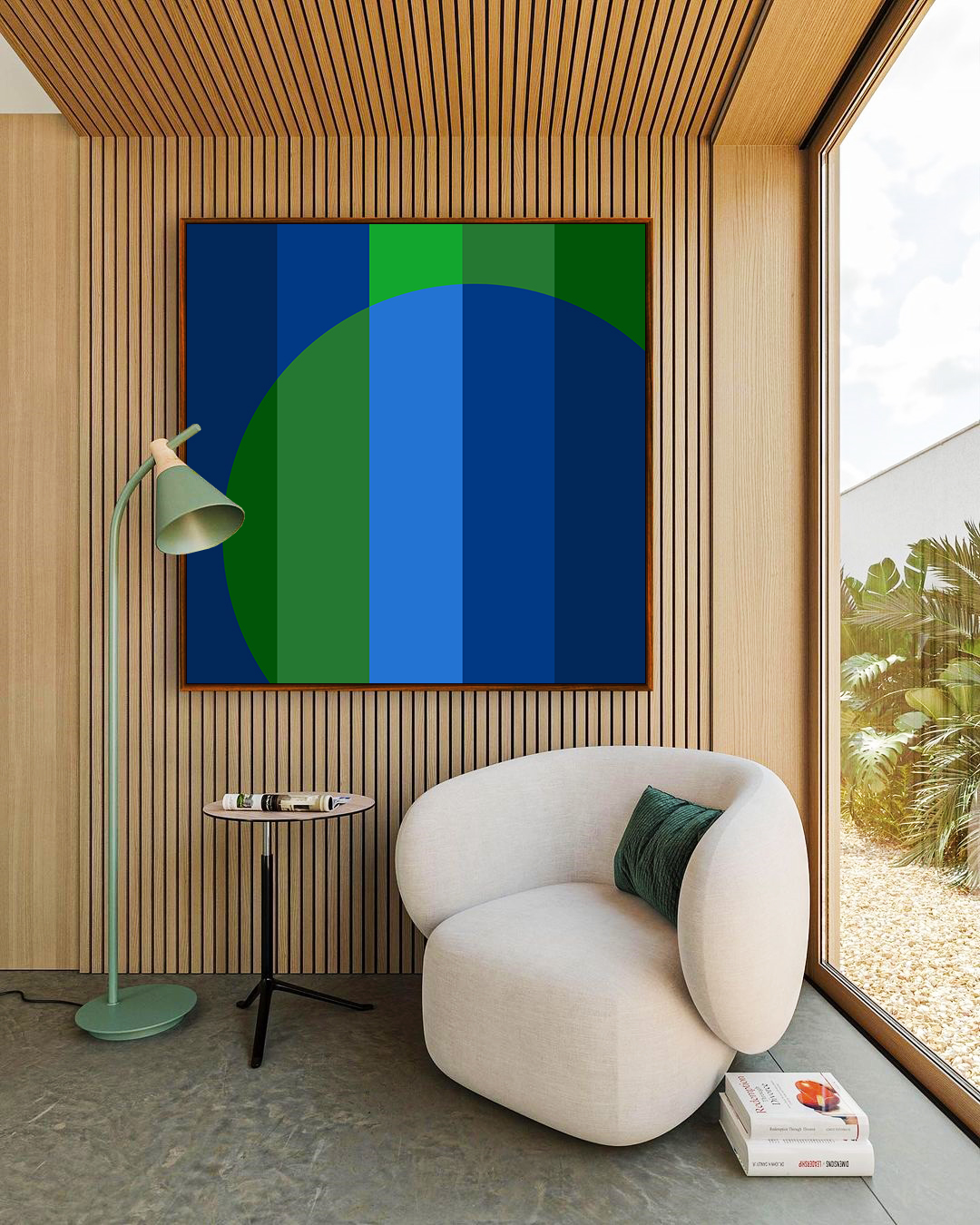 Com linhas elegantes em degradê azul marinho e verde esmeralda, este Quadro Quadrado abstrato geométrico traz impacto visual refinado. A moldura moderna realça sua presença, sendo perfeito para sala de estar, quarto, hall de entrada ou escritório.