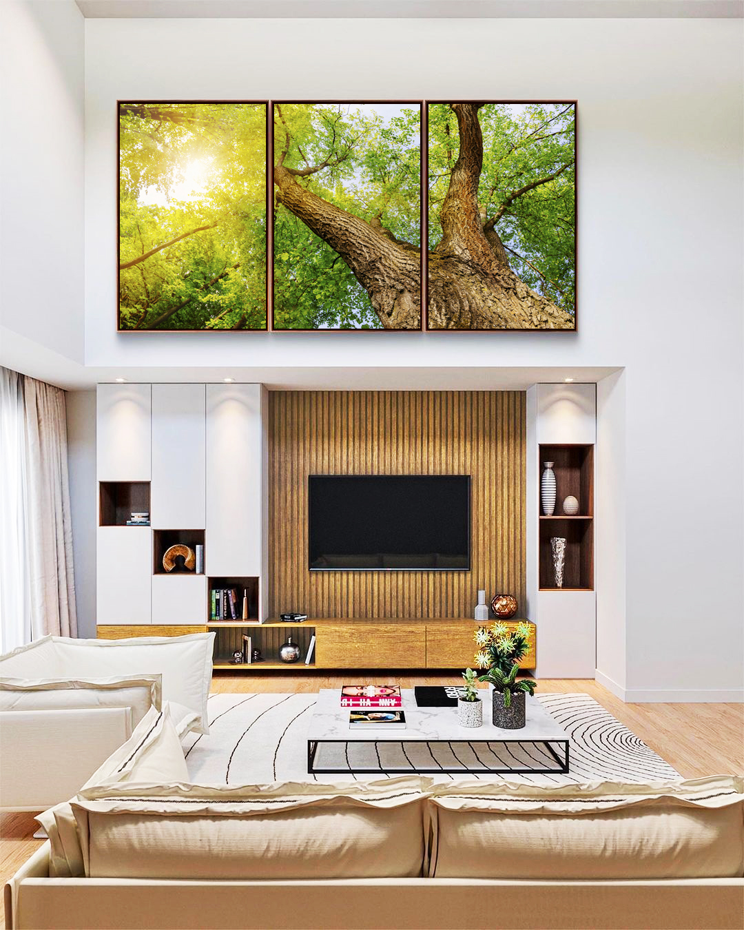 Modernize seu espaço com este Trio de Quadros da copa de uma árvore com folhas verdes iluminadas pelo sol. Perfeito para quem busca aconchego e sofisticação. Indicado para salas, escritórios e halls. Impressão em canvas premium com moldura sofisticada.