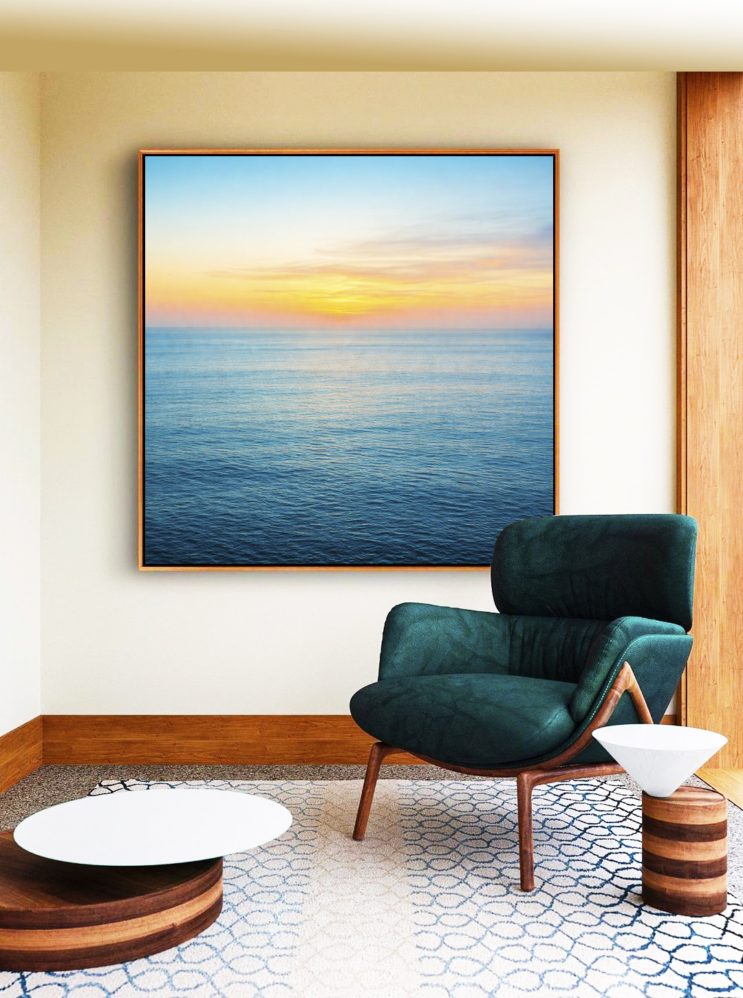 A delicadeza do nascer do sol sobre o mar transmite paz e sensação de recomeço. Ideal para valorizar salas, quartos e espaços com decoração leve, natural e atemporal.