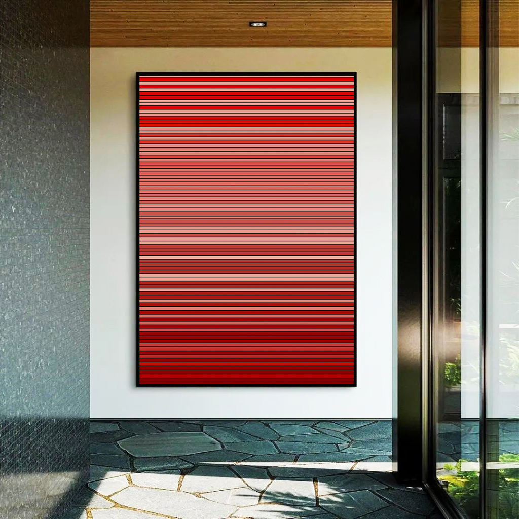 Renove seu espaço com este Quadro Vertical abstrato em degradê de listras carmim e salmão. A arte elegante em canvas com moldura flutuante traz sofisticação e modernidade para salas, quartos, escritórios e halls de entrada, realçando a decoração.