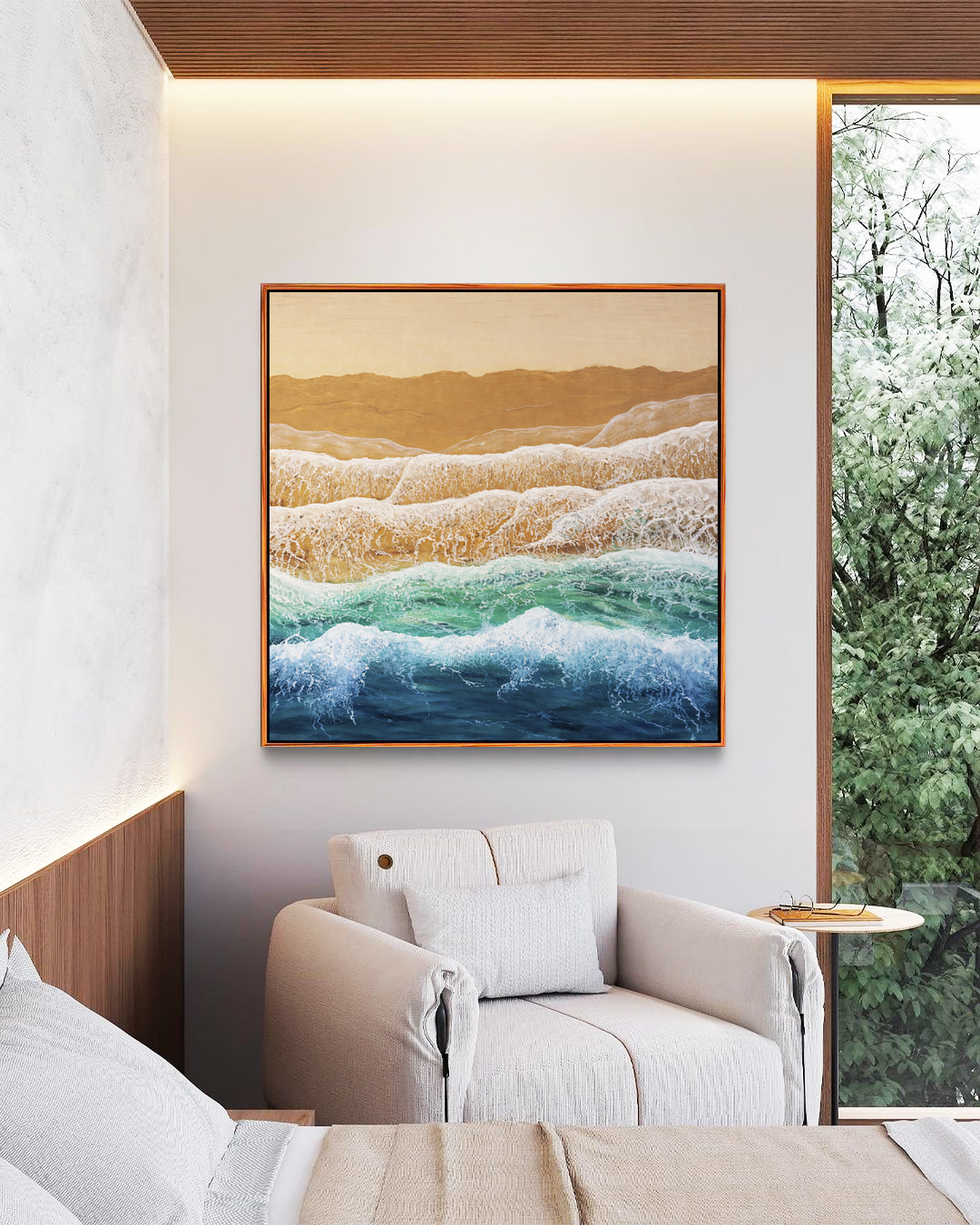 Mar azul turquesa com ondas suaves e espuma branca sobre areia dourada. Perfeito para decoração de salas, quartos, escritórios ou ambientes modernos que valorizam natureza e serenidade.