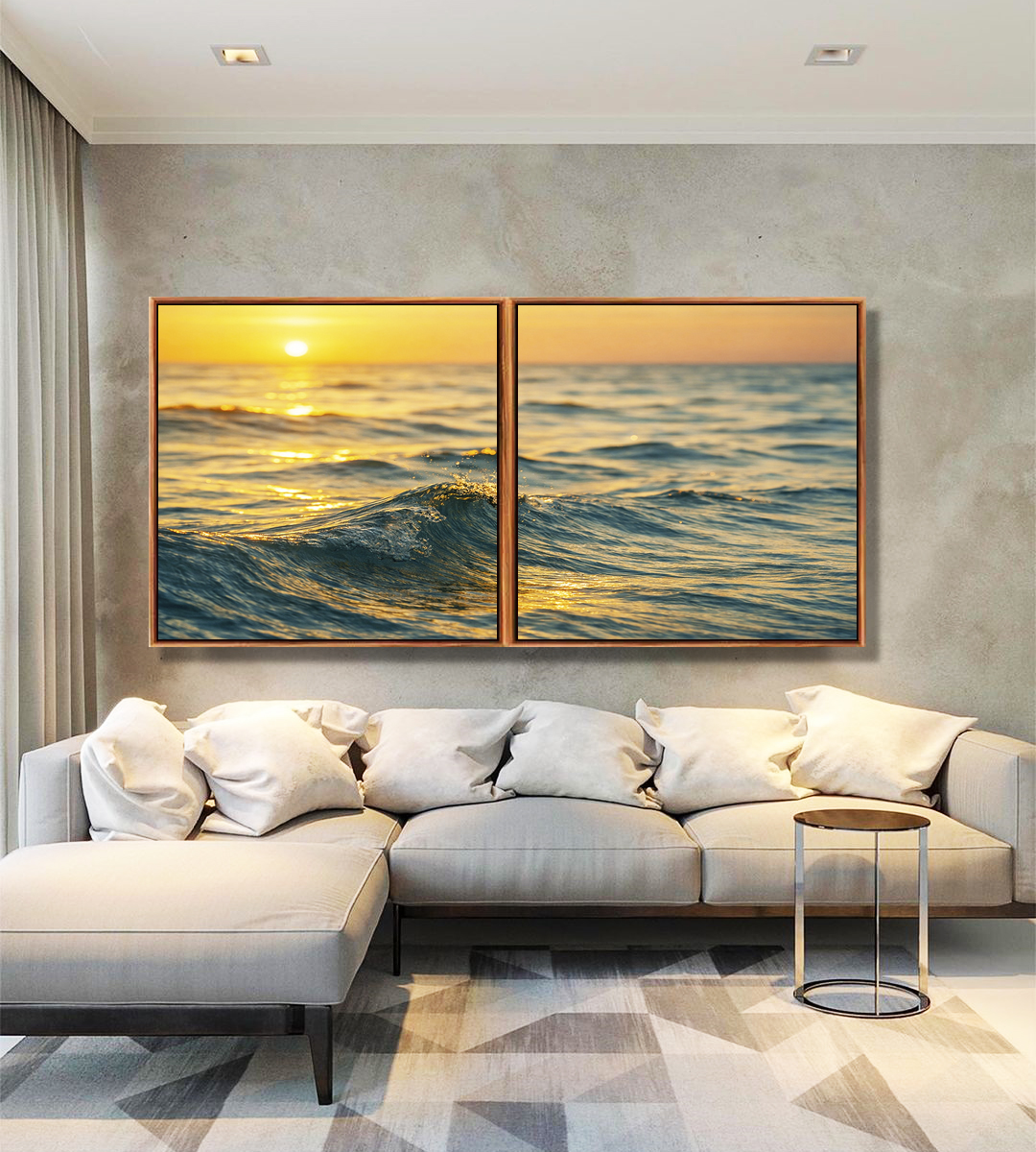 Pôr do sol sobre o mar com ondas suaves e brilho prateado que transmite paz e elegância. Ideal para sala de estar, quarto, escritório, consultório ou casa de praia. Perfeito para decoração litorânea, estilo contemporâneo e ambientes relaxantes.