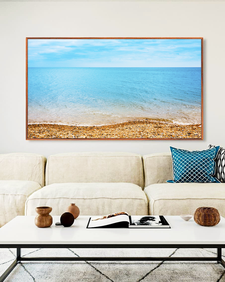 Transforme sua decoração com este Quadro Horizontal que traz o mar azul, céu claro e pedras em harmonia natural. Ideal para sua sala, quarto ou hall de entrada, com moldura moderna que valoriza cores e detalhes, trazendo frescor e elegância.