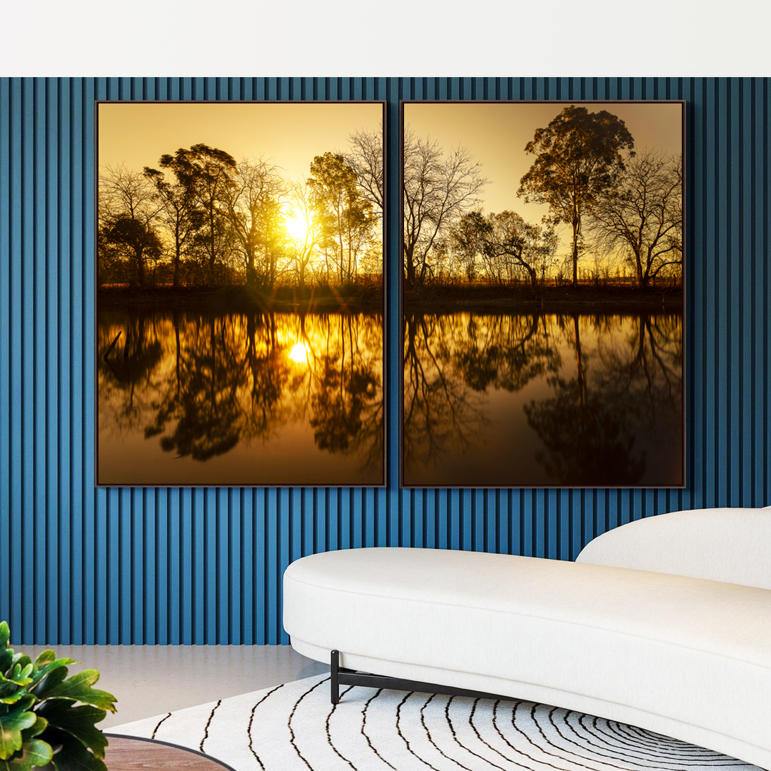 Acrescente sofisticação à sua decoração com este Duo de Quadros. O reflexo das árvores no lago ao pôr do sol cria uma atmosfera acolhedora. Ideal para salas, escritórios e quartos. Impressão premium em tela canvas com moldura refinada e durável.