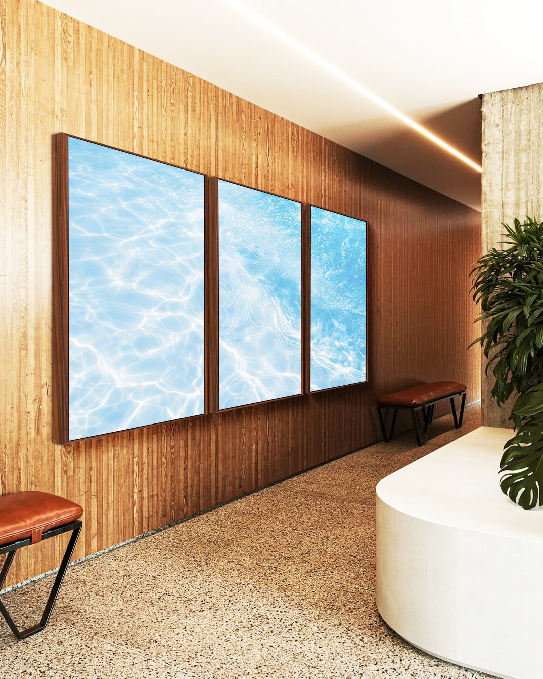 Mar azul claro com reflexos do sol e areia suave abaixo, trazendo frescor e tranquilidade ao ambiente. Ideal para salas, quartos e espaços que pedem leveza. Refrescante e Belíssimo!