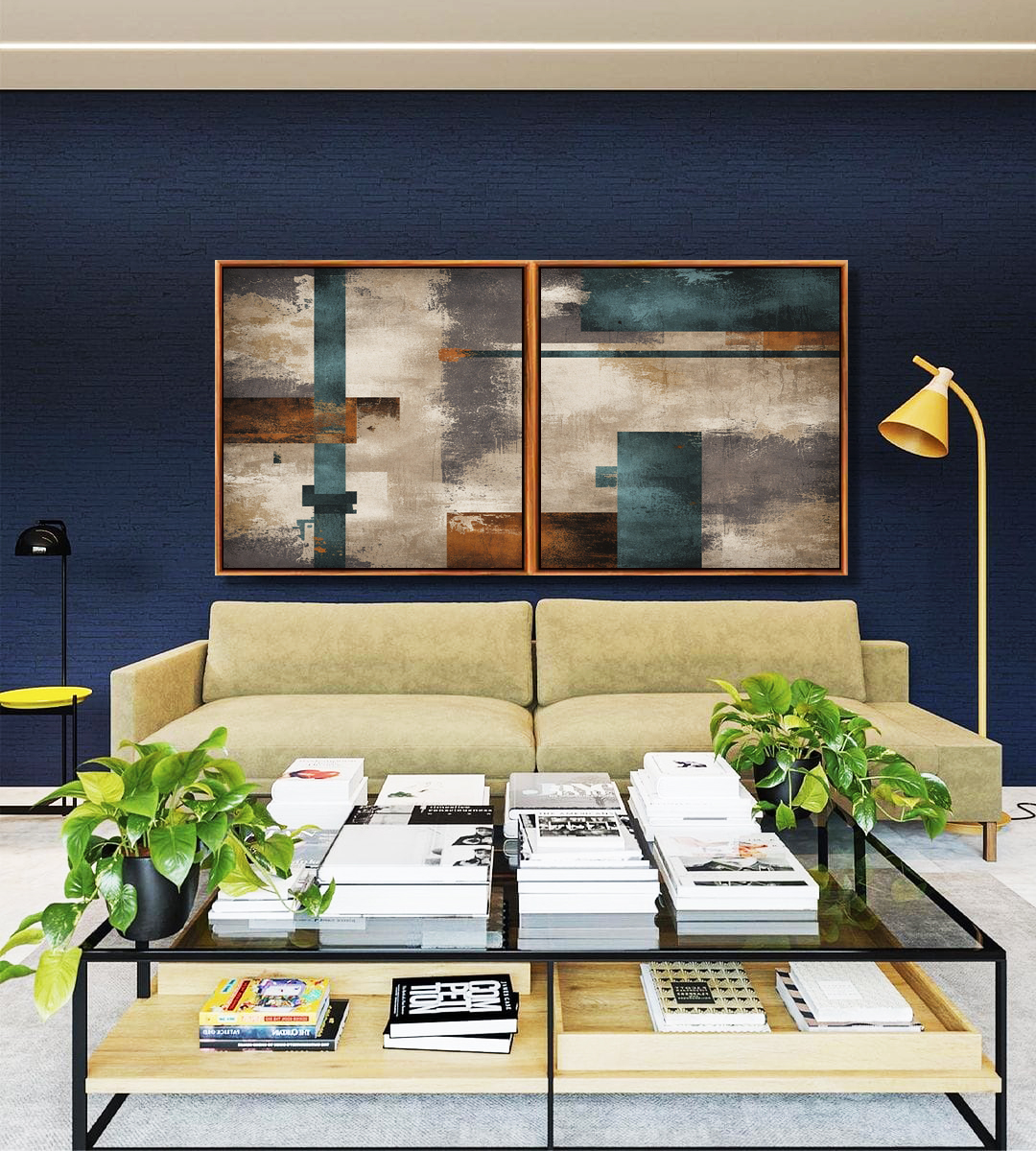 Duo de Quadros Quadrados Abstrato Azul Bronze Cinza Concreto Canvas Moldura