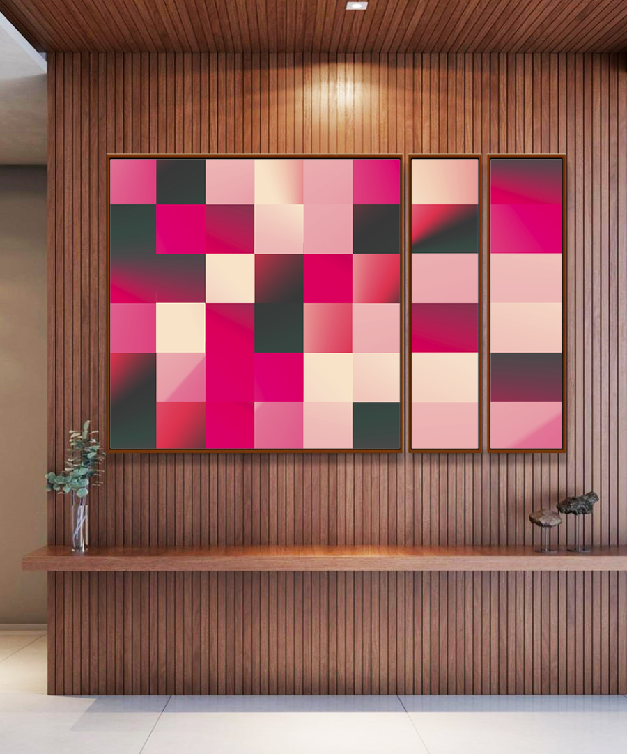 Com harmonia entre o mosaico geométrico e o degradê em rosa, este Trio de Quadros Estilizados traz um toque moderno e delicado. Perfeito para decorar salas, escritórios ou quartos com estilo elegante e atmosfera acolhedora.