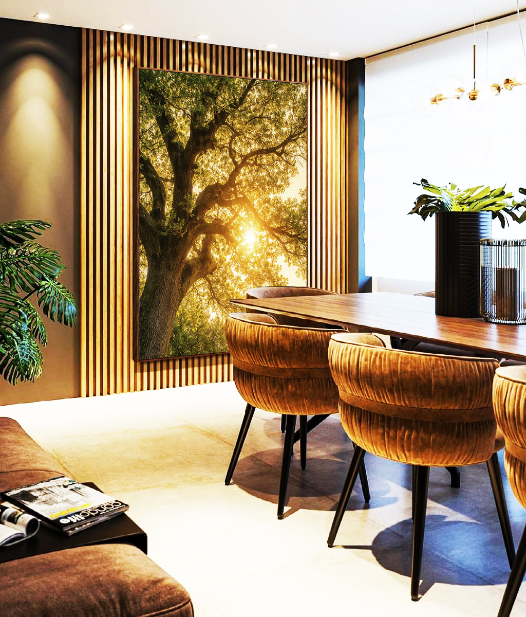 Árvore iluminada por luzes douradas do sol, criando uma atmosfera quente e serena. Ideal para sala, quarto ou ambientes que pedem aconchego, paz e conexão com a natureza.