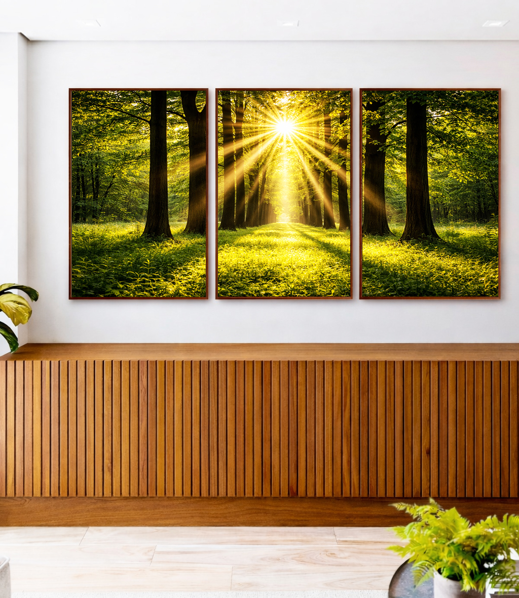 Trio de Quadros Caminho Entre Árvores Luzes do Sol Natureza Paisagem Canvas Moldura