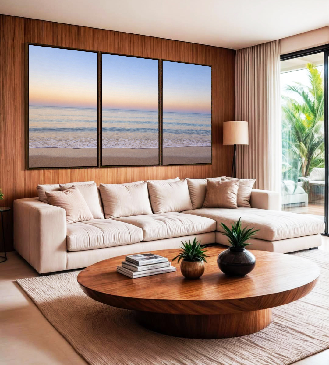 A harmonia entre mar azul prateado e céu lilás cria uma cena relaxante e luminosa. Este Trio de Quadros é ideal para decorar salas de estar, escritórios refinados ou quartos, elevando o ambiente com elegância e inspiração natural.