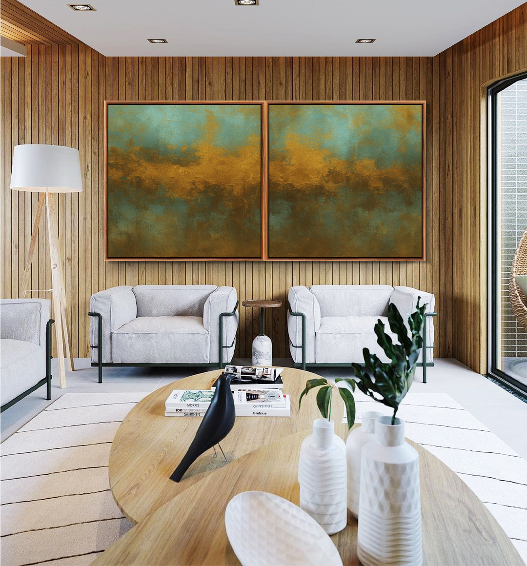 Este Duo de Quadros Quadrados Abstrato apresenta tons terrosos de verde, marrom e dourado, criando uma atmosfera elegante e acolhedora. A escolha certa para salas modernas, quartos sofisticados, escritórios elegantes ou halls amplos. Belíssimo!