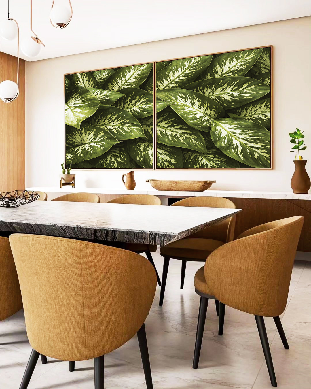 Folhagem da planta comigo-ninguém-pode com tons verdes intensos e desenho natural marcante. Inspiração em natureza tropical que traz frescor e elegância à decoração. Muito buscada em estilos modernos. Valoriza salas, quartos ou escritórios.