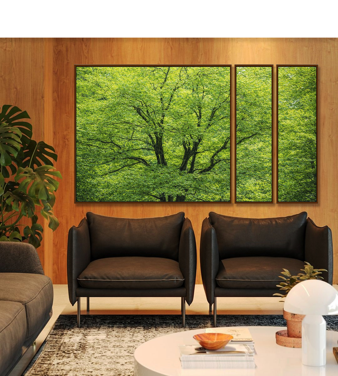 Árvores com folhagem verde intensa formam uma cena natural cheia de vida e harmonia. O Trio de Quadros Estilizados é ideal para decorar salas de estar, escritórios refinados ou quartos, valorizando o espaço com arte natural e atmosfera acolhedora.