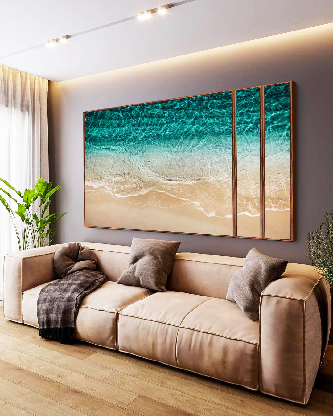 Destaque sua decoração com este Trio de Quadros Estilizados do mar turquesa. Os tons turquesa e areia clara remetem à natureza e à tranquilidade, sendo perfeitos para salas, quartos e escritórios. Impressão de alta definição sobre canvas, com moldura resistente e refinada.