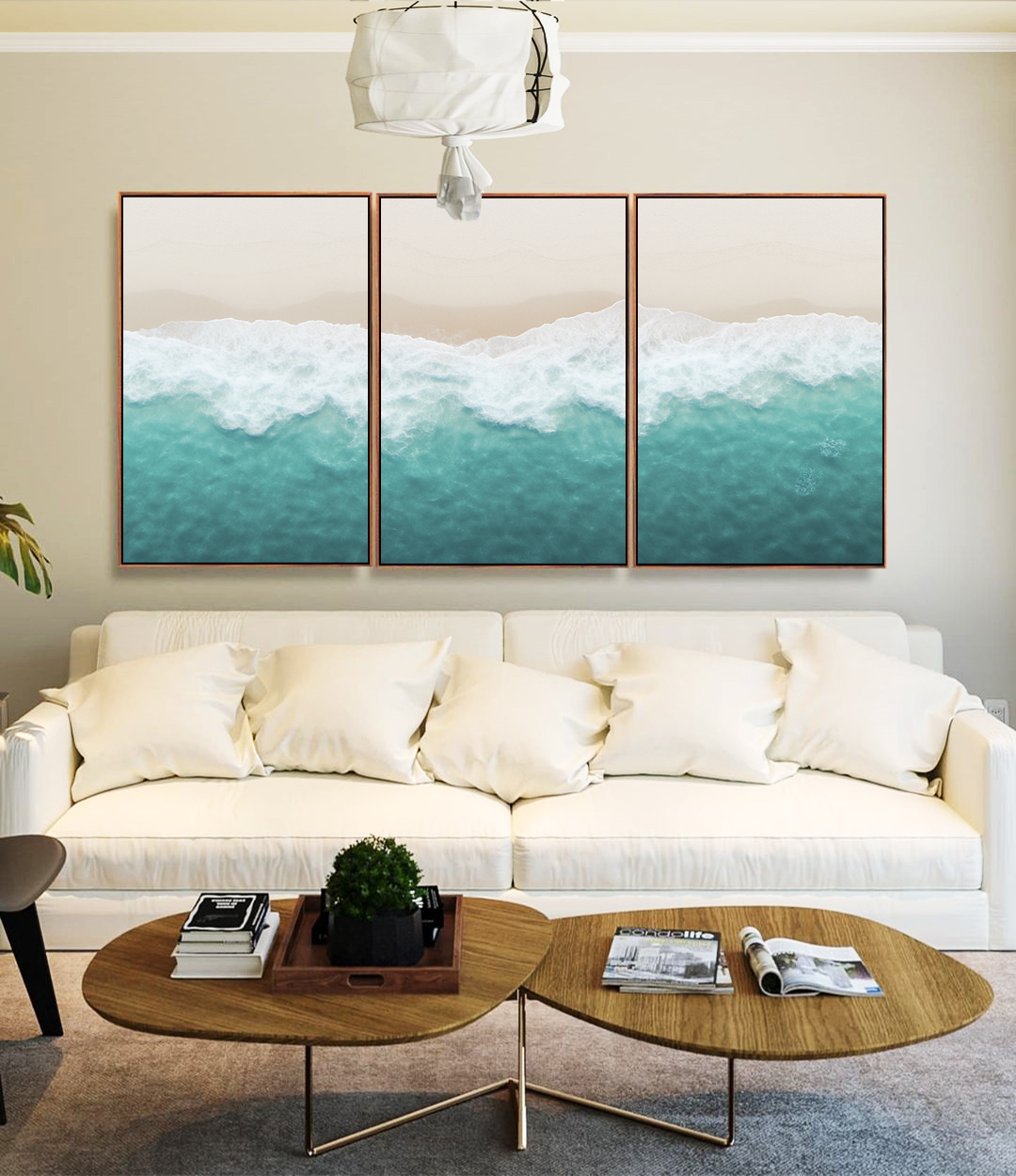 Calmo e luminoso, este Trio de Quadros com litoral claro e mar turquesa cria um ponto focal natural e elegante. Ideal para compor salas amplas, quartos refinados, escritórios elegantes ou halls de entrada com presença visual.