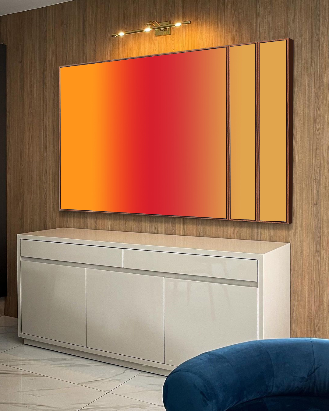 Trio de Quadros Estilizados abstrato com degradê em tons de amarelo âmbar e coral, criando calor, movimento e sofisticação. A escolha ideal para salas, quartos, escritórios ou halls de entrada, iluminando o ambiente com elegância contemporânea.