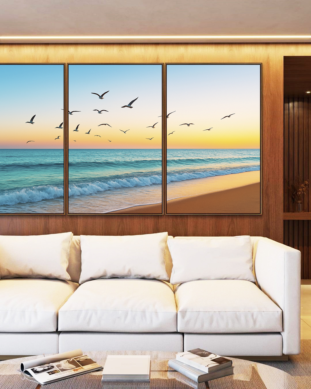 A leveza dos pássaros em voo sobre o mar inspira liberdade e tranquilidade nesta arte encantadora. Um Trio de Quadros que transmite paz e elegância, sendo a escolha ideal para realçar salas, quartos ou escritórios com charme natural.