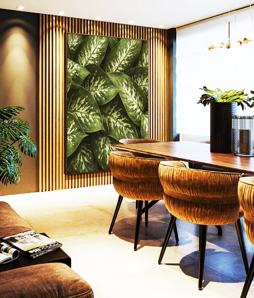 Folhagem da planta comigo-ninguém-pode com tons verdes intensos e desenho natural marcante. Inspiração em natureza tropical que traz frescor e elegância à decoração. Muito buscada em estilos modernos. Valoriza salas, quartos ou escritórios.