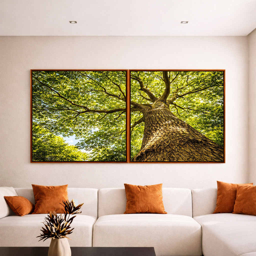 Duo de Quadros Quadrados Árvore Galhos Folhas Verdes Vibrantes Céu Paisagem Natureza Canvas Moldura