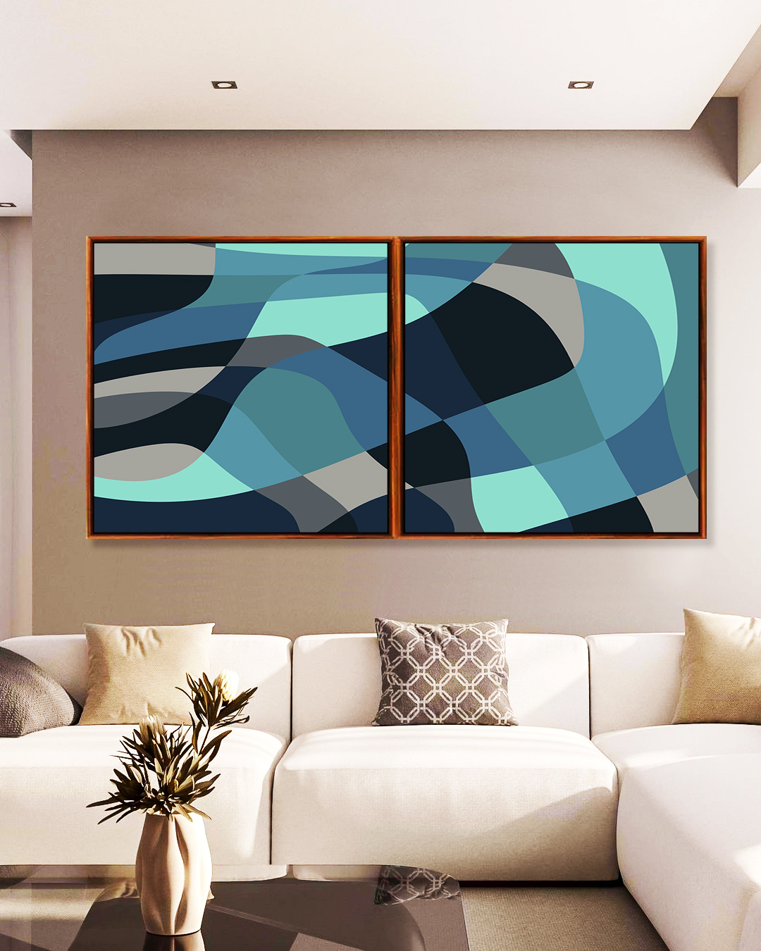 Com mosaico abstrato em azul e cinza, este Duo de Quadros Quadrados adiciona harmonia, profundidade e elegância à decoração. Ideal para salas amplas, quartos sofisticados ou halls de entrada que pedem um toque moderno e visualmente impactante.
