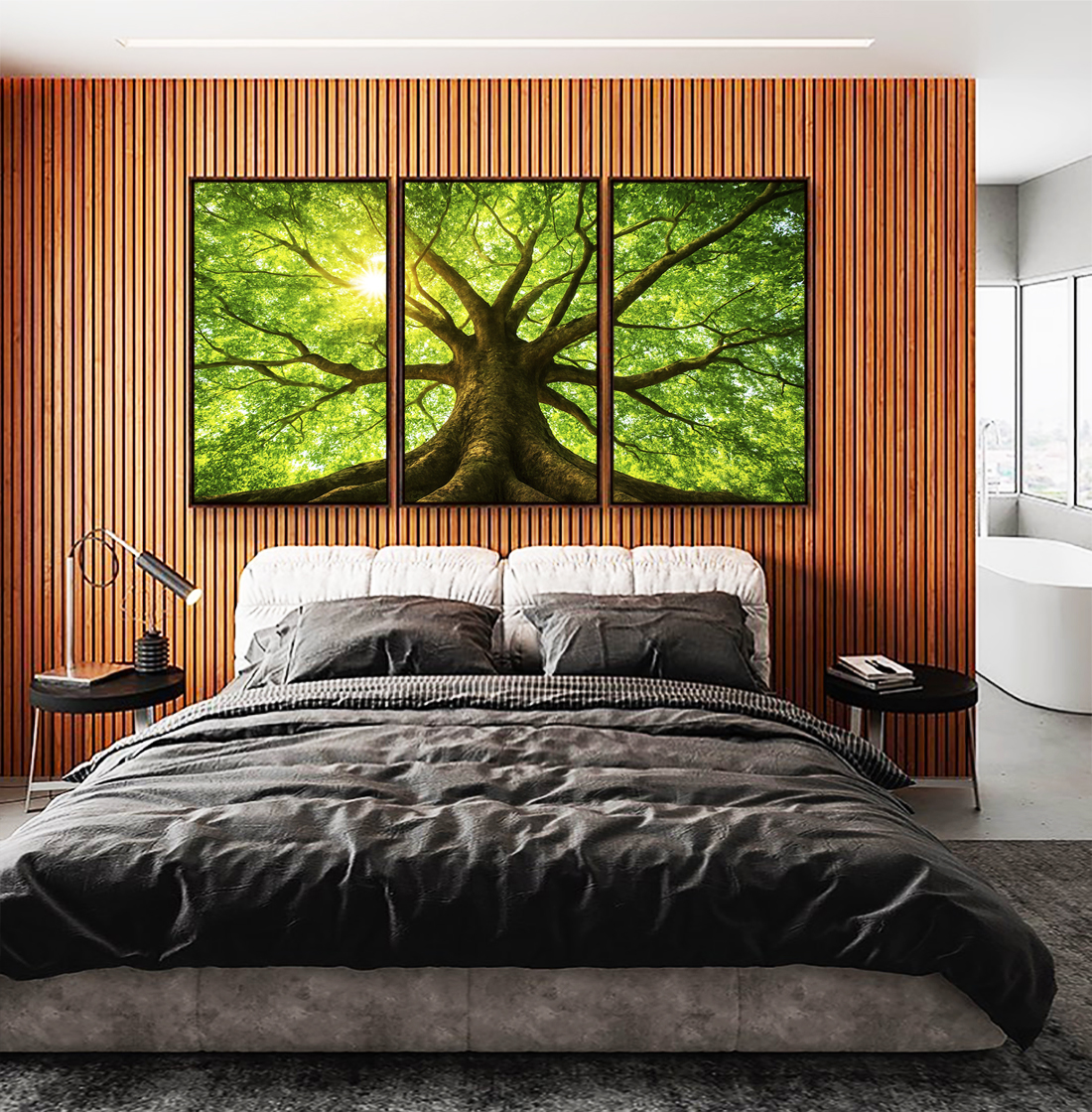 Com luzes do sol refletindo entre folhas verdes, este Trio de Quadros traz sensação de frescor e tranquilidade ao ambiente. A escolha certa para salas, quartos ou escritórios. valorizando a decoração com paisagem natural e harmonia visual.
