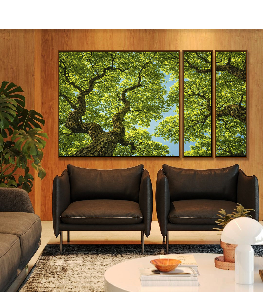 Trio de Quadros Estilizados Árvores Folhas Verdes Céu Azul Limpo Natureza Canvas Moldura