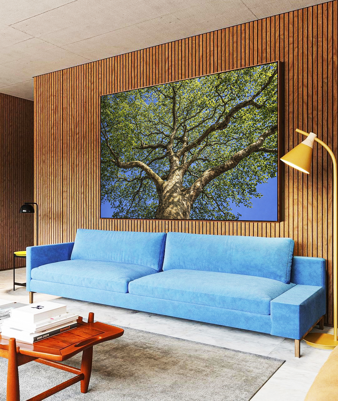 Copa de árvore com folhagem verde sob céu azul cria atmosfera leve e natural. Elemento de natureza que traz frescor, equilíbrio e conexão com o exterior. Decoração inspirada em paisagem natural, muito procurada para salas, escritórios e recepções.