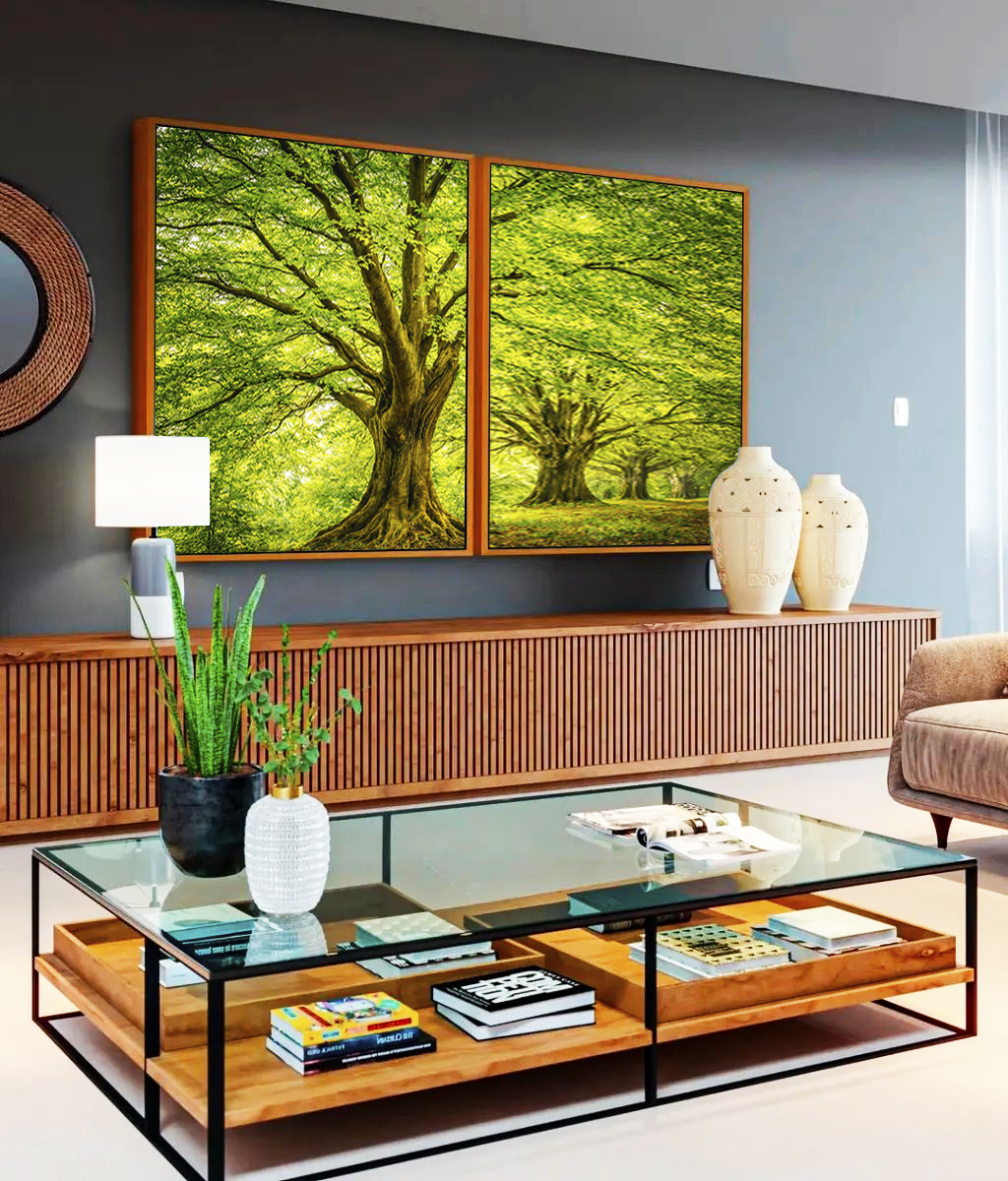 Árvores em meio à natureza iluminada, criando uma atmosfera leve e acolhedora. Ideal para sala, quarto ou espaços que pedem tranquilidade, frescor e conexão com o verde.