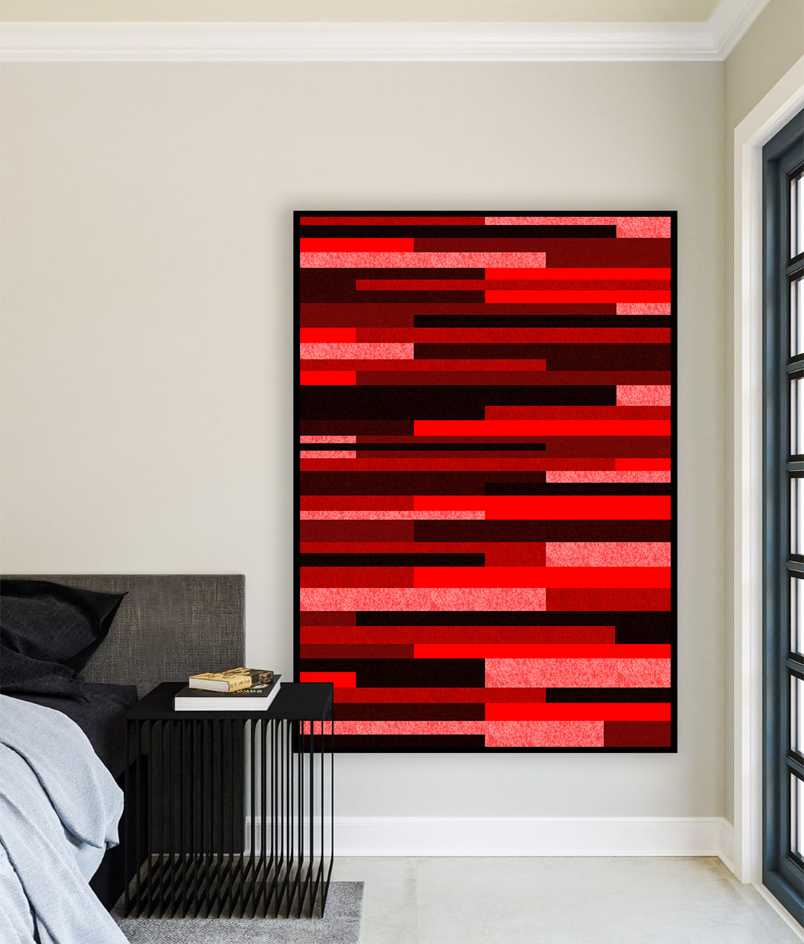 O mosaico geométrico em vermelho vinho e preto cria um abstrato elegante e expressivo. Este Quadro Vertical é a escolha ideal para salas, quartos ou escritórios, adicionando profundidade, contraste e um visual contemporâneo à decoração.