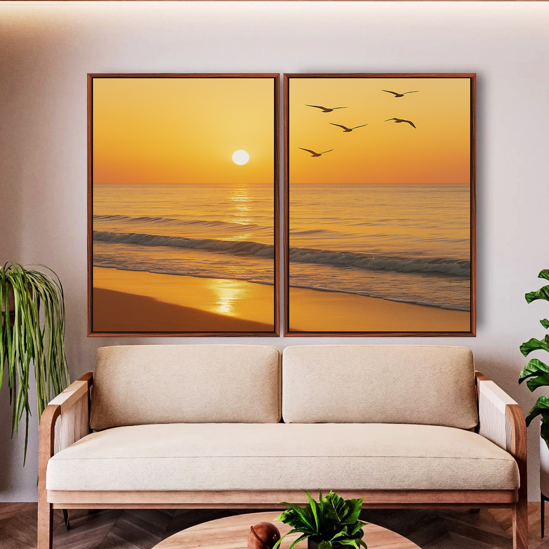 O encanto do pôr do sol refletido nas águas tranquilas cria uma cena envolvente e acolhedora. Um Duo de Quadros que é a escolha certa para decorar salas, halls de entrada ou quartos elegantes. Quadro de Harmonia Visual.
