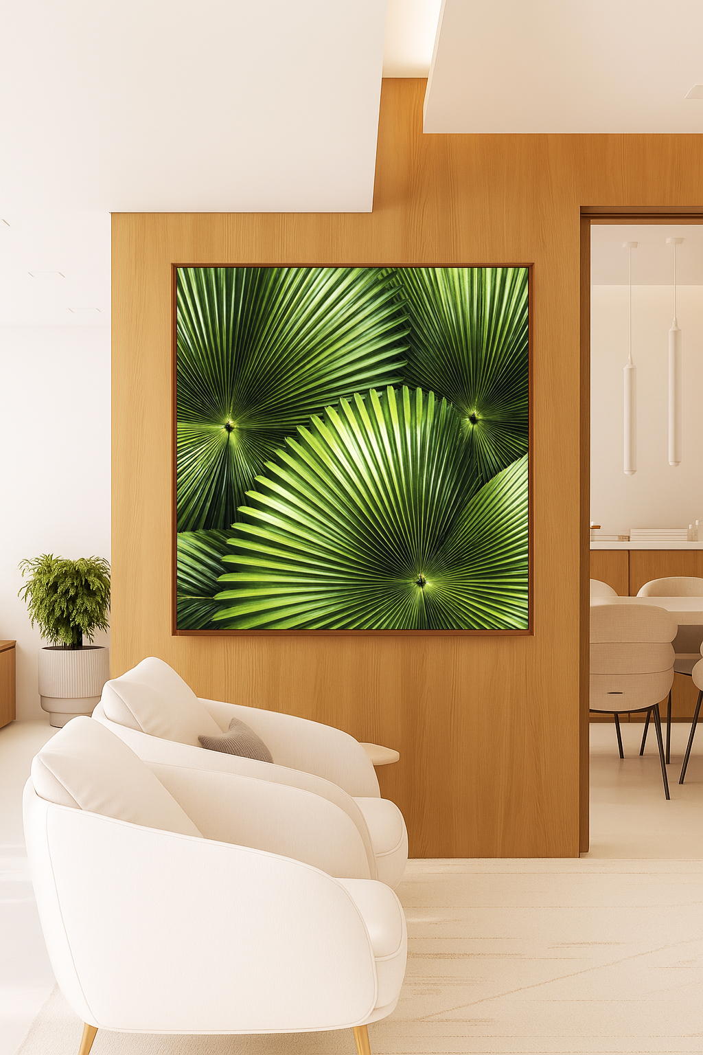 Folhas de palmeira-leque em verde intenso formando desenho radial sofisticado inspirado na natureza tropical. Estilo botânico moderno que adiciona vida, frescor e elegância ao ambiente.