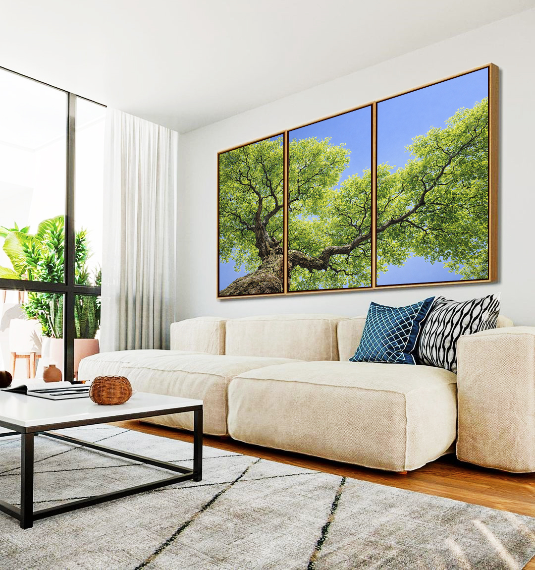 Trio de Quadros Céu Azul Vivo Copa de Árvore Folhas Verdes Paisagem Natureza Canvas Moldura