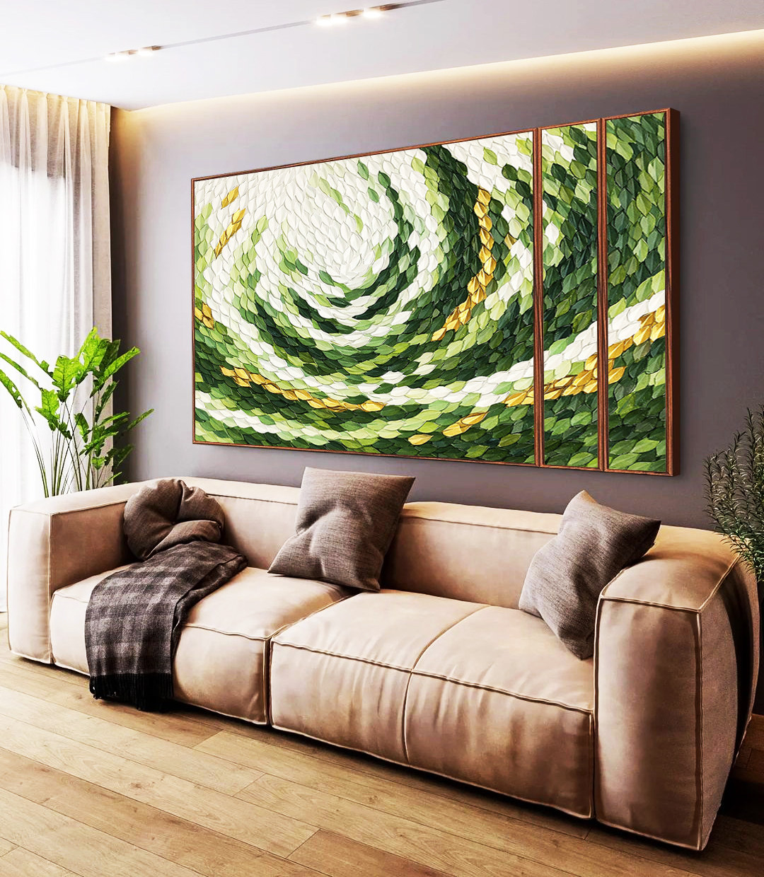 Abstrato em verde e dourado com textura orgânica e efeito dinâmico que cria profundidade e destaque. Perfeito para decoração contemporânea, minimalista ou elegante. Indicado para sala, quarto, consultório ou ambiente profissional.