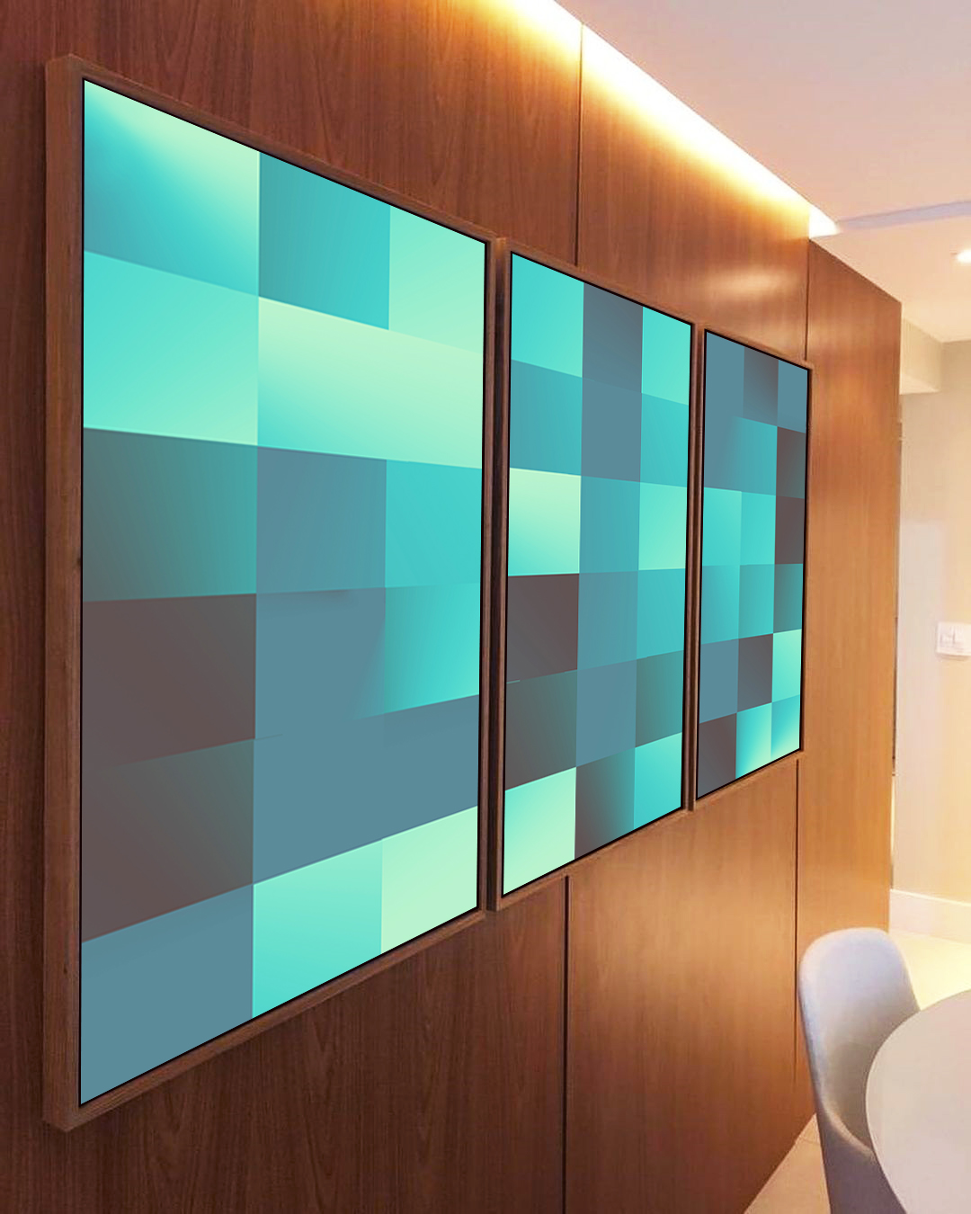 O Trio de Quadros combina formas geométricas e o degradê azul turquesa para criar uma estética moderna e serena. Uma escolha certa para quem deseja realçar salas, quartos ou escritórios com arte contemporânea e harmoniosa.